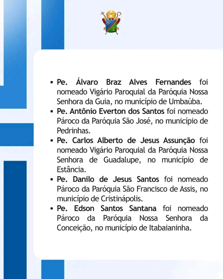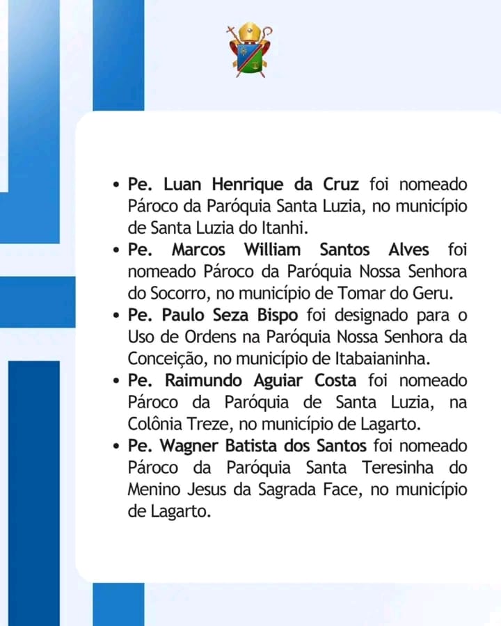 Em nota oficial da Diocese de Estância, Padre Wagner Batista deixa a Paroquia Nossa Senhora do Anparo em Riachão do Dantas.
